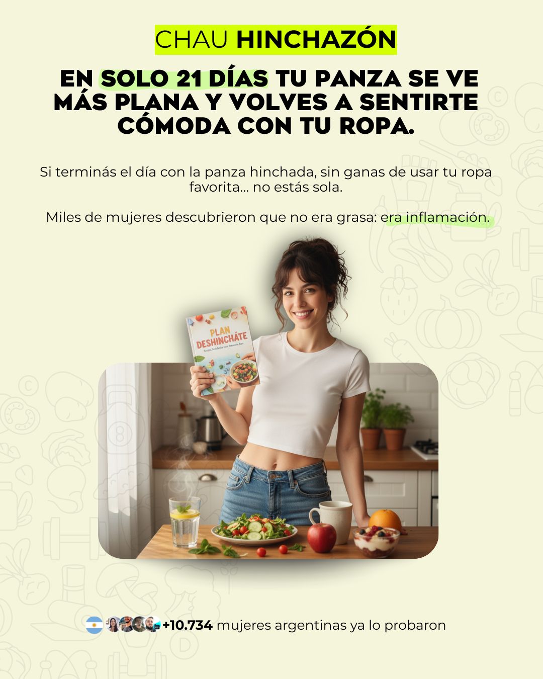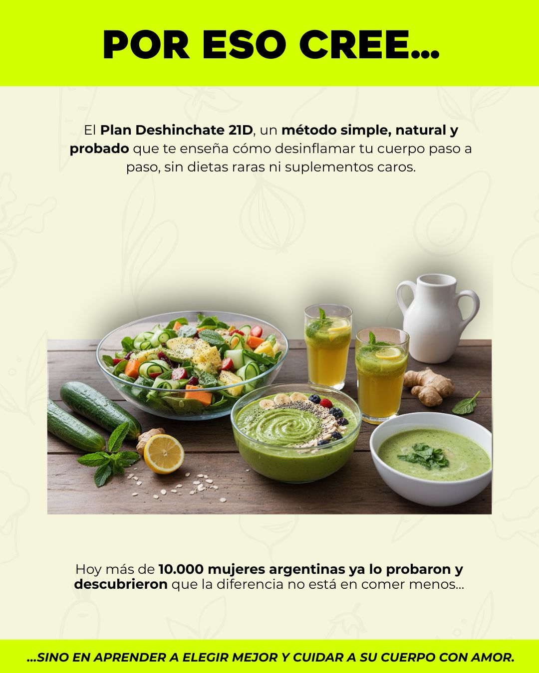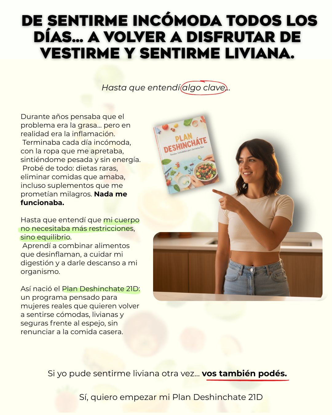 Con el Plan Deshinchate 21D vas a descubrir cómo desinflamar tu cuerpo de forma natural, sentirte liviana, con más energía y volver a disfrutar de vestirte sin incomodidad.