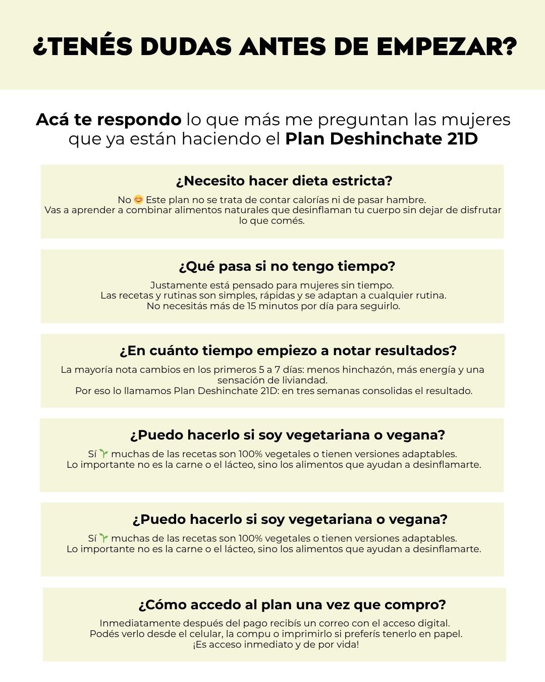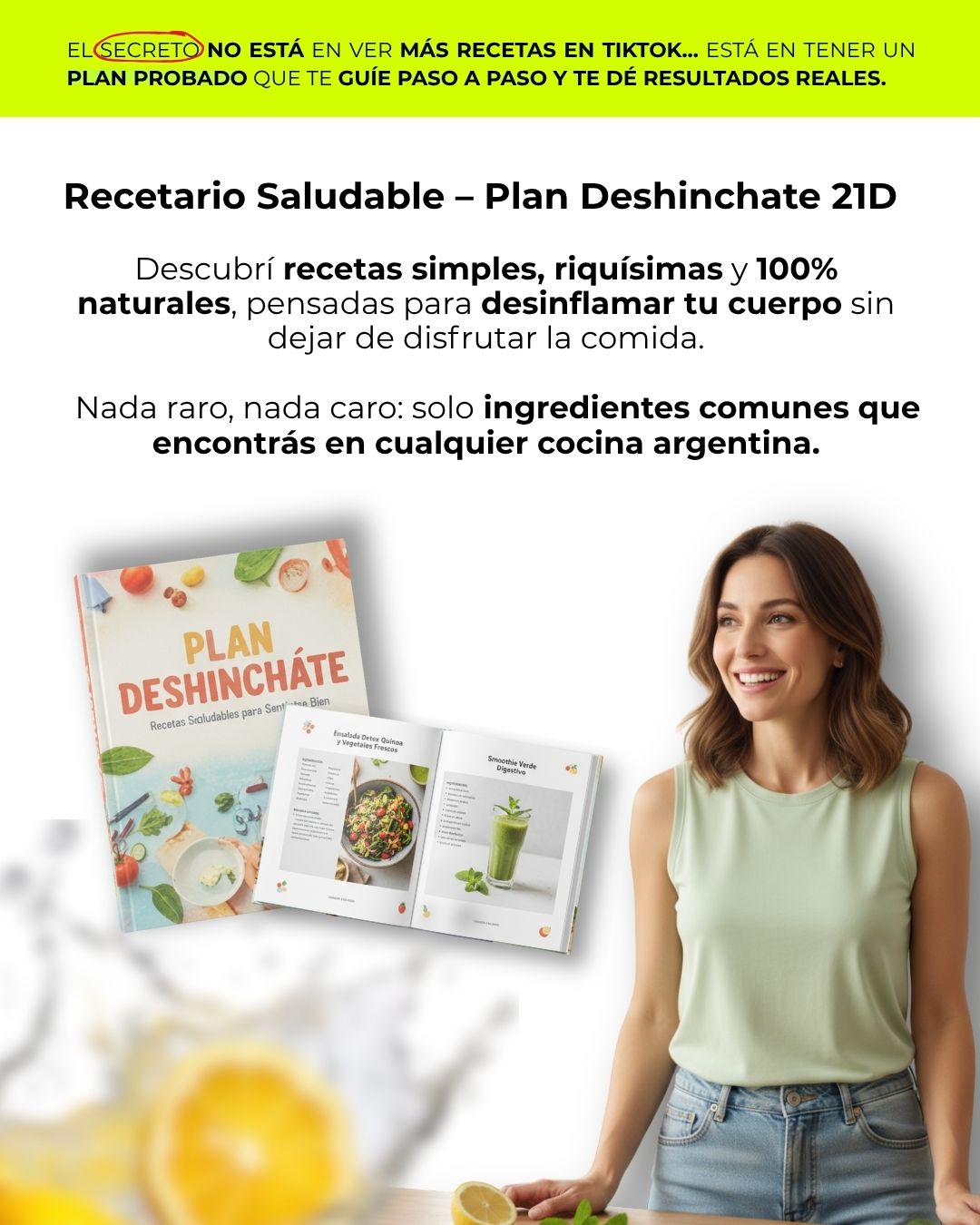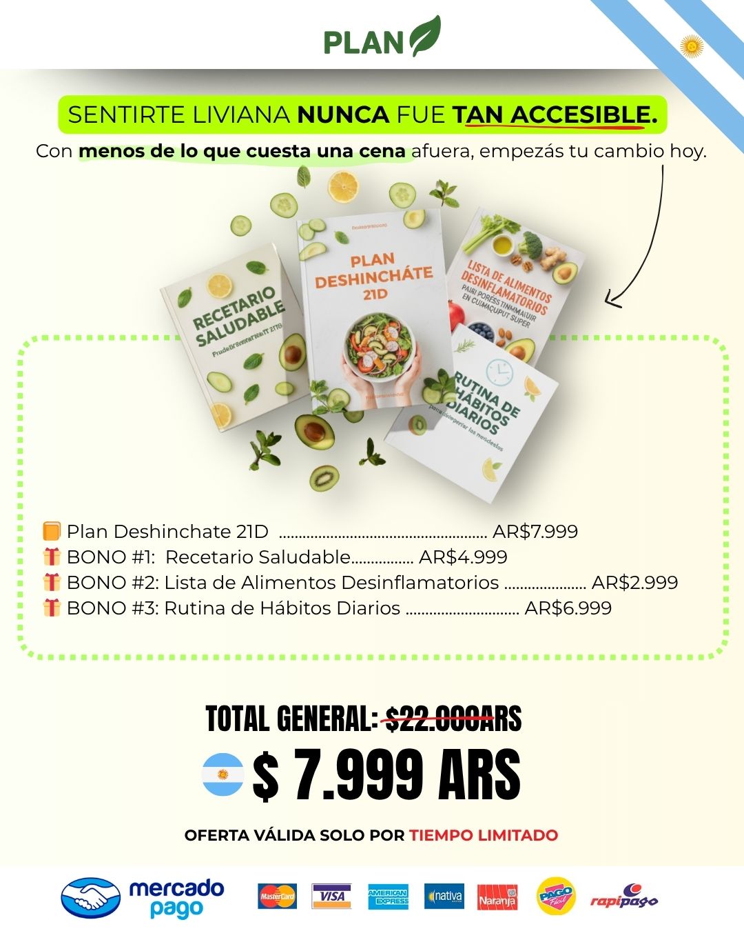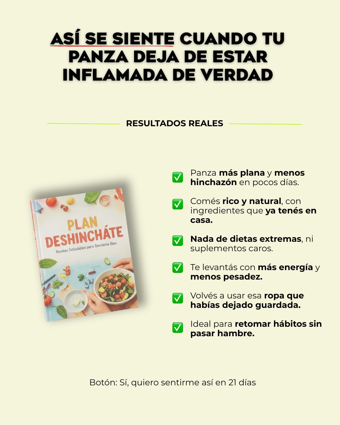 Con el Plan Deshinchate 21D vas a descubrir cómo desinflamar tu cuerpo de forma natural, sentirte liviana, con más energía y volver a disfrutar de vestirte sin incomodidad.